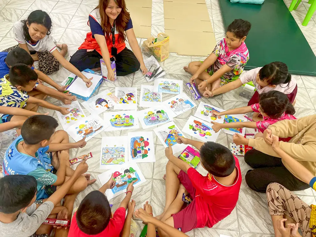 ให้ความรู้ และกิจกรรมสันทนาการให้กับเด็กๆ ในศูนย์พักพิง ควบคู่กับการให้ความรู้เรื่องเตรียมพร้อมรับมือภัยพิบัติ เพื่อสนับสนุนสุขภาวะทางจิตสังคมของเด็ก