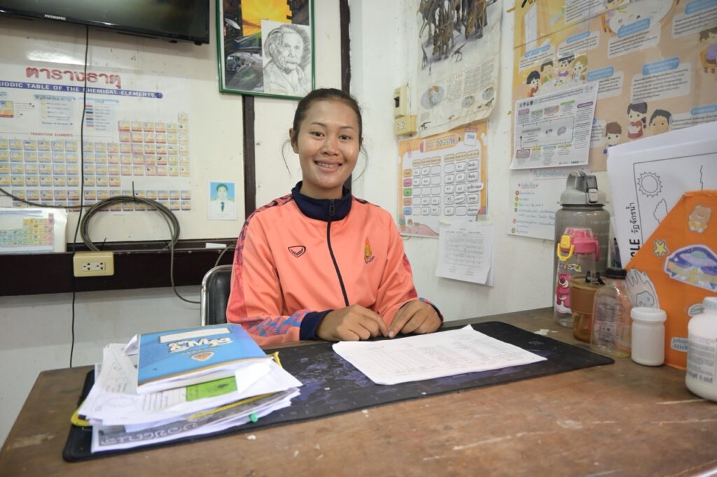 ครูเฟิร์สเล่าด้วยรอยยิ้มว่าอุปกรณ์กีฬาเหล่านั้นเป็นจุดเริ่มต้นที่ทำให้เธอสนใจและตัดสินใจที่จะมุ่งสู่เส้นทางการเป็นครูพละ เนื่องจากการมีอุปกรณ์กีฬาทำให้เธอได้เรียนรู้และรู้จักการเล่นกีฬาอย่างถูกต้องและสนุกสนาน จนกลายเป็นความชอบและความถนัดที่นำไปสู่การตัดสินใจเลือกเรียนต่อในสาขาวิชาที่เกี่ยวข้องกับพลศึกษา