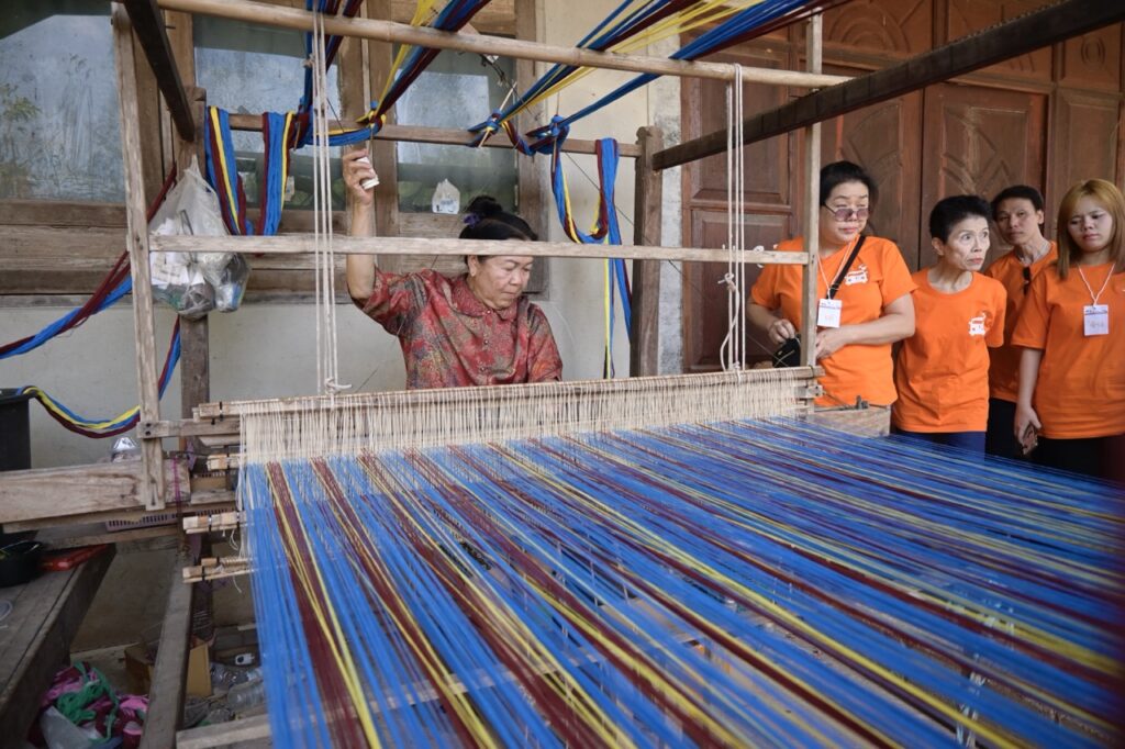 คุณป้าวัยเก๋าจาก กลุ่มทอผ้าห่มสี่เขา บ้านสุขสวัสดิ์ โชว์ฝีมือการทอผ้าแก่ทีมผู้มาเยือน