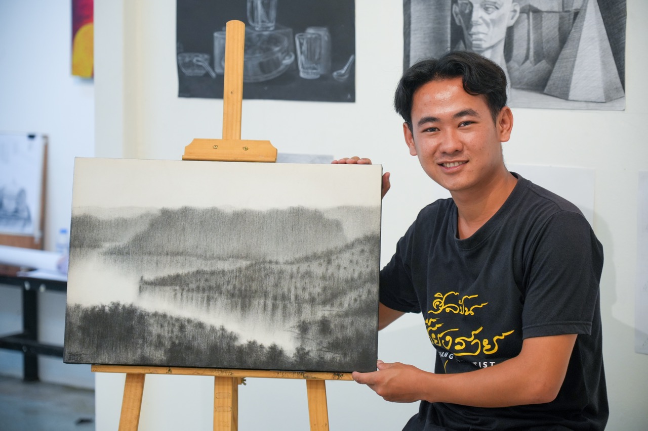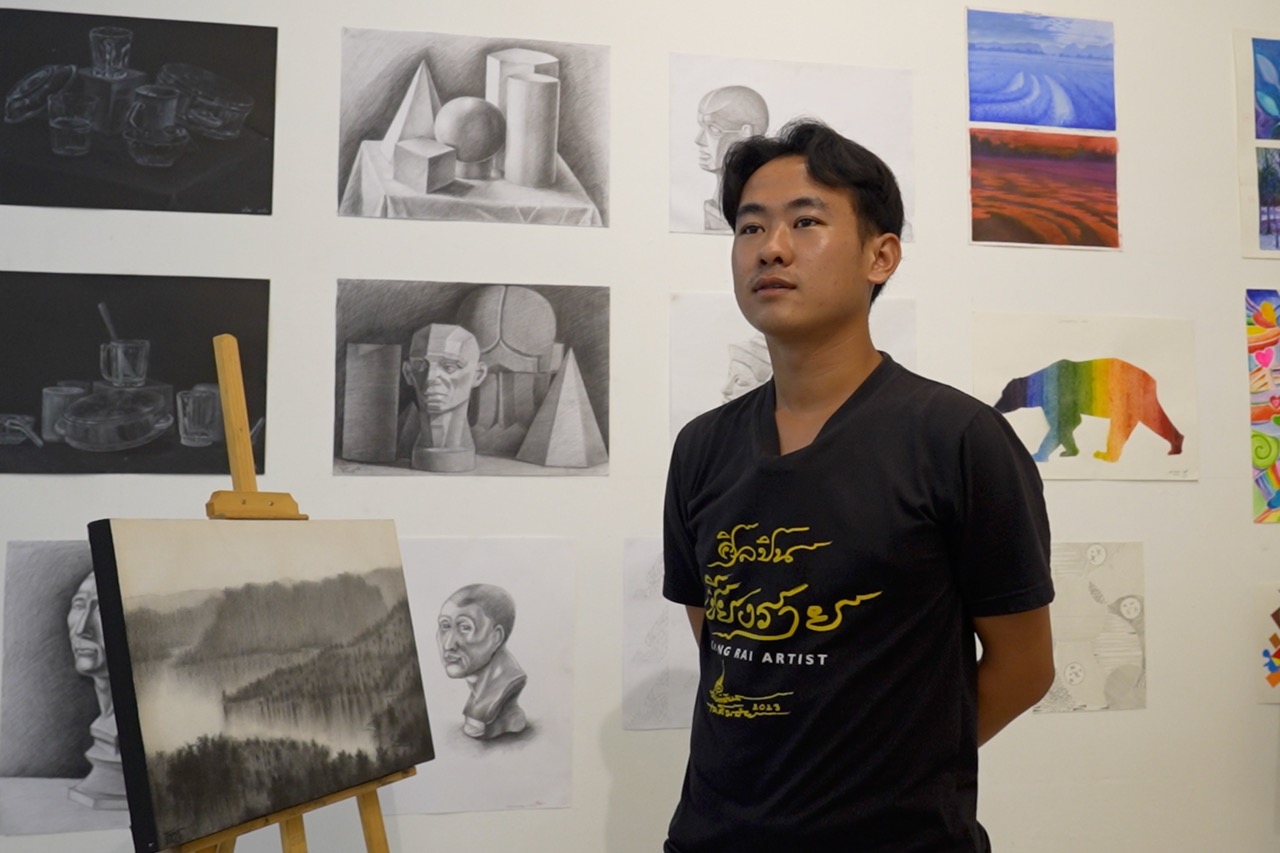 ที่แกลเลอรี่ของมหาวิทยาลัยสงฆ์เชียงราย พื้นที่จัดแสดงผลงานสร้างสรรค์ของนิสิตศิลปะ วันนี้เราได้พบกับ น้องเจ ธนากร แซ่ลี นิสิตปริญญาตรีชั้นปีที่ 2 สาขาพุทธศิลปกรรม ผู้มีหัวใจรักศิลปะมาตั้งแต่วัยเด็ก และเป็นหนึ่งในผู้ได้รับทุนการศึกษาจาก มูลนิธิศุภนิมิตแห่งประเทศไทย ภายใต้โครงการ ‘อุปการะเด็ก’ และ โครงการ ‘ส่งน้องจบ ป.ตรี’