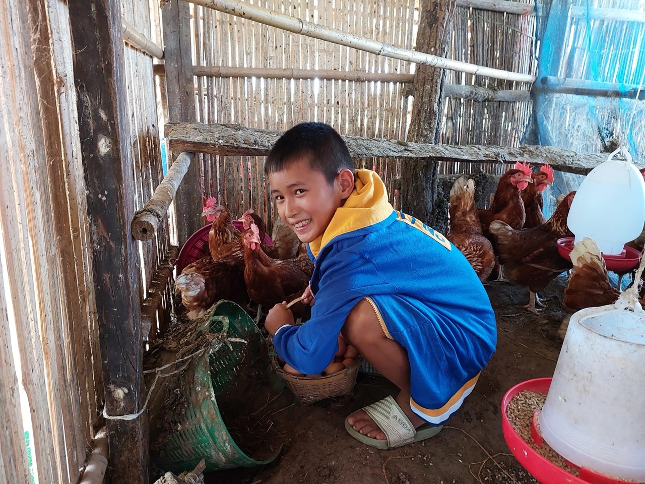 ความช่วยเหลือในช่วงแรก “มีทั้งอุปกรณ์การเรียน เช่น เสื้อผ้า กระเป๋า สมุด ดินสอ และการสนับสนุนด้านอาชีพ เช่น ไก่พันธุ์ไข่ เป็ดพันธุ์ไข่ ทำให้ครอบครัวเรามีกิน มีรายได้ค่ะ”