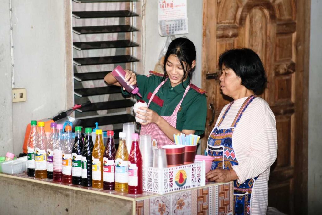 “หนูจะทำขนมในวันเสาร์ค่ะ ส่วนหนึ่งจะแบ่งไว้ขายพร้อมกับย่าในหมู่บ้าน และอีกส่วนจะเก็บไว้ขายให้เพื่อนที่โรงเรียน ซึ่งทำแต่ละครั้งหนูจะขายได้ประมาณครั้งละ 200-300 บาท หักทุนแล้วหนูก็พอมีเงินเก็บไว้ไปโรงเรียน ทุกวันนี้หนูใช้เงินจากการขายขนมเพื่อเป็นค่าอาหารกลางวันที่โรงเรียนค่ะ ช่วยแบ่งเบาภาระของย่าได้เยอะเลยค่ะ” น้องมะนาว กล่าวอย่างภูมิใจ