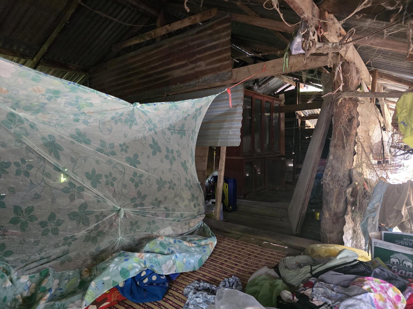 หนึ่งในนั้นคือบ้านของน้องแก้ม ที่แทบจะเรียกว่าบ้านไม่ได้ เพราะเป็นเพิงไม้เก่าที่ไร้ฝาผนัง ต้องใช้เพียงไม้อัด สังกะสี ผ้า และป้ายไวนิลมาปิดบังกันแดด กันลม และกันฝนไปวัน ๆ ไม่มีแม้กระทั่งห้องน้ำที่ปลอดภัย ต้องขอใช้ห้องน้ำจากเพื่อนบ้านแทน ภายในห้องนอนคับแคบเต็มไปด้วยเสื้อผ้า ที่นอน และมุ้งเก่าที่ขาดรุ่งริ่ง ข้าวของต่าง ๆ ชำรุด ทรุดโทรมและมีฝุ่นจับหนา ปราศจากความสะดวกสบายอย่างสิ้นเชิง นี้หรือคือความยากลำบากที่เด็กหญิงตัวเล็ก ๆ ต้องเผชิญโดยไม่มีทางเลือก ทว่าวันนี้ น้องแก้มยังคงเฝ้ารอความช่วยเหลือด้วยหัวใจที่เต็มไปด้วยความหวัง..