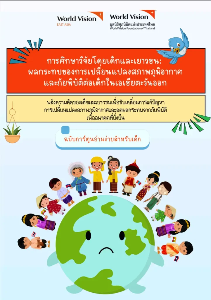 งานวิจัยของพวกเขา ‘การศึกษาวิจัยโดยเด็กและเยาวชน: ผลกระทบของการเปลี่ยนแปลงสภาพภูมิอากาศและภัยพิบัติต่อเด็กในเอเชียตะวันออก ได้เสร็จสิ้นลงแล้ว เป็นการวิจัยที่ขับเคลื่อนโดยเด็กและเยาวชน (Child-Led Research) และ World Vision East Asia ได้นำผลงานของเด็กและเยาวชนมาบอกต่อสู่ผู้ใหญ่ทุกๆ คน โดยจัดทำเป็นเวอร์ชั่นการ์ตูน… อ่านง่ายเหมือนการ์ตูน แต่เนื้อหาเข้มข้นระดับภูมิภาค ครอบคลุมทุกประเด็นที่เด็กและเยาวชนอยากให้ผู้ใหญ่ทุกคนได้รับรู้ว่าการเปลี่ยนแปลงสภาพภูมิอากาศมีผลกระทบต่อพวกเขาอย่างไร