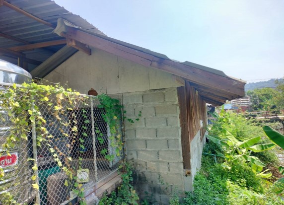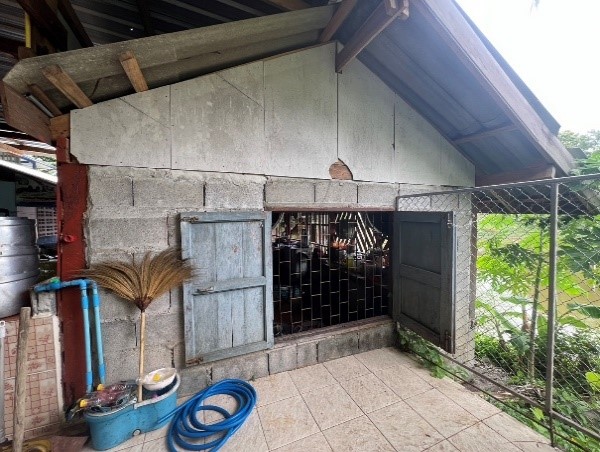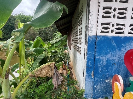 The kitchen building, constructed in 2008 beside a water pond, is at risk of collapsing at any time. Due to ongoing water erosion which causes soil subsidence, the building foundation tilted, and visible cracks have appeared in the walls, while the wooden structure is inadequate to withstand the tilting of the foundation. This substandard condition poses potential harm to the cooks who use the building to cook meals for the children every day, endangering their well-being and the hygiene standards for meal preparation.