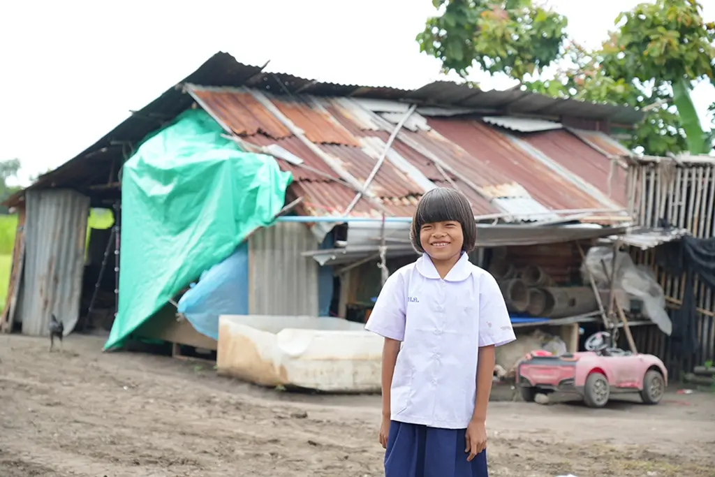 เด็กหญิงตัวเล็ก ๆ ที่เติบโตมาในโลกที่เต็มไปด้วยความไม่แน่นอน ไม่มีพ่อแม่คอยดูแล อาศัยอยู่กับยายเพียงลำพังในบ้านเก่า ๆ ที่ผุพังตามกาลเวลา บ้านหลังนั้นไม่มีแม้แต่หลังคาที่กันฝนได้ ยามฝนตก น้องต้องกางเต็นท์นอนอยู่ในบ้าน เพราะน้ำรั่วลงมาทุกคืน เสาไม้ผุเต็มไปด้วยรังปลวก พื้นบ้านมีแต่ดินทราย เศษหินที่เดินแล้วบาดเท้า สายไฟก็ห้อยระโยงระยางจนเห็นลวดทองแดง เป็นอันตรายที่อยู่ใกล้ตัวน้องทุกวัน แม้แต่หน้าต่างประตูก็ไม่อาจป้องกันอันตรายจากภายนอกได้ ไม่มีแม้แต่ห้องน้ำที่เหมาะสม ความแร้นแค้นที่เธอต้องทนแบกรับนั้น ไม่ควรเป็นชะตากรรมของเด็กคนใดในโลกนี้